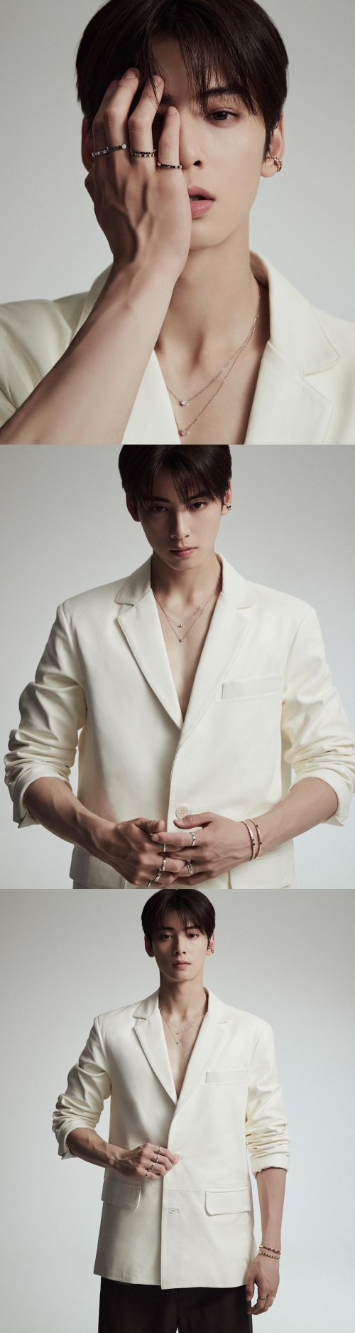 アイボリーカラーのジャケットを羽織り、首元にはシンプルなネックレスが輝いている。華奢なアクセサリーの数々が、チャ・ウヌのたくましい体をより一層男らしく見せた。
