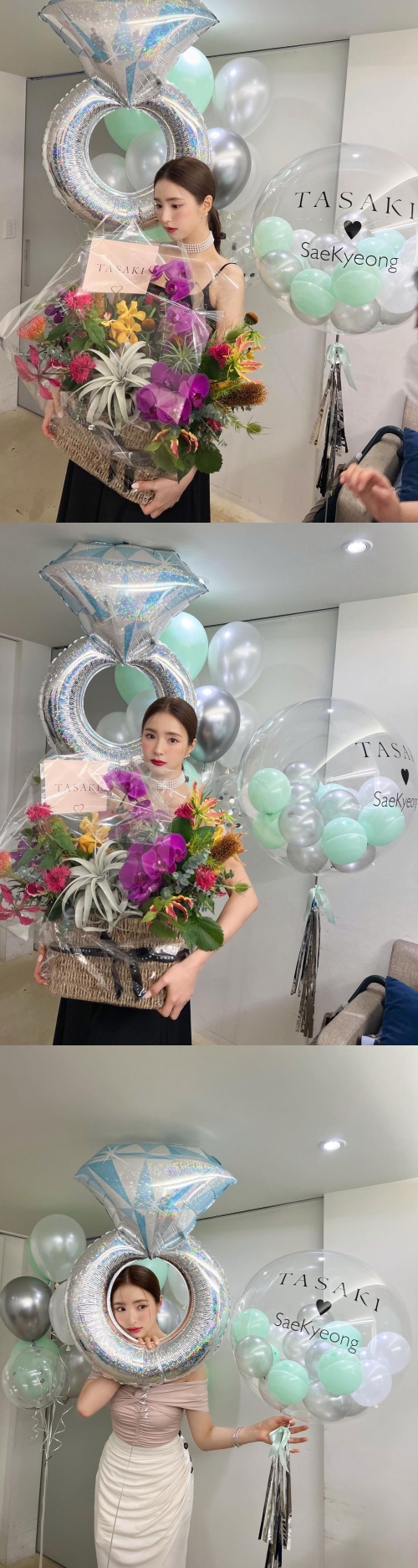 別の写真では、指輪型のバルーンから顔をのぞかせたお茶目な姿で、異なる雰囲気を醸し出している。ピンクのオフショルダートップスにタイトスカートを合わせ、フェミニンな印象を与えた。