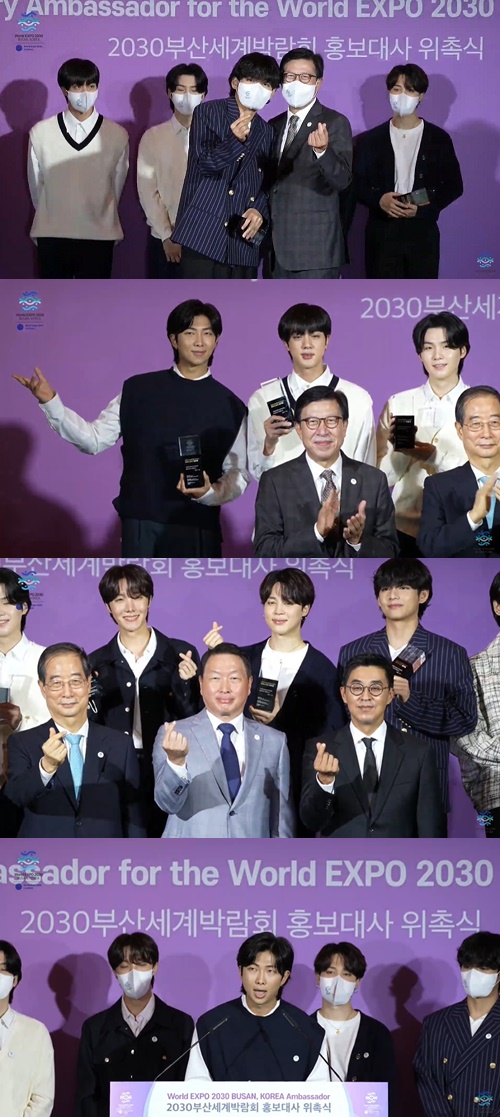 ハン国務総理は「2030世界万博の広報大使を快諾してくれた、世界人が自慢するグローバルスターBTSに特別な感謝を伝える」とし、「官民がワンチームになって力を合わせれば(万博の誘致を)実現することができると信じる」と述べた。またBTSの曲をもじって、「ダイナマイトのような活動をお願いする」と付け加えた。