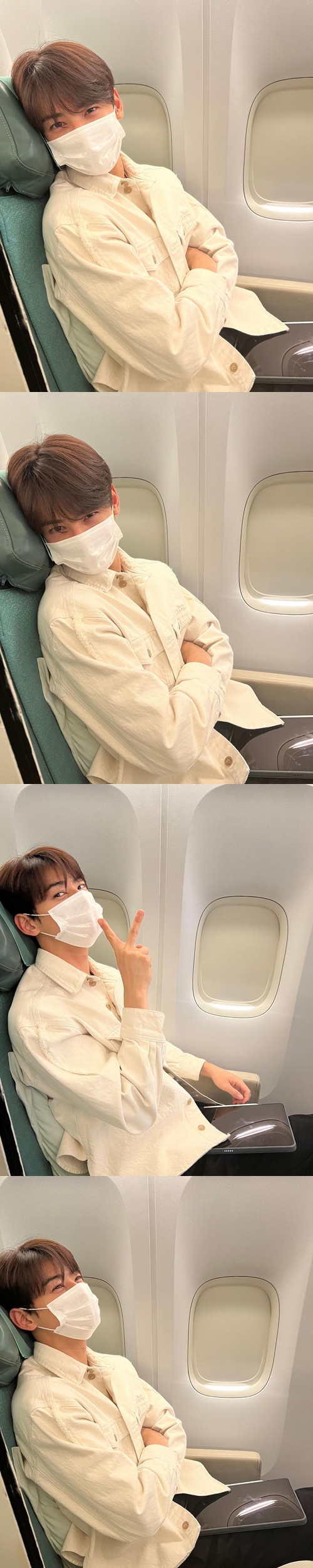 公開された写真には、飛行機の中でマスクをつけたままカメラに笑いかけるチャ・ウヌの姿が写っている。マスク越しにもかかわらず、チャ・ウヌのハンサム具合が伝わる。