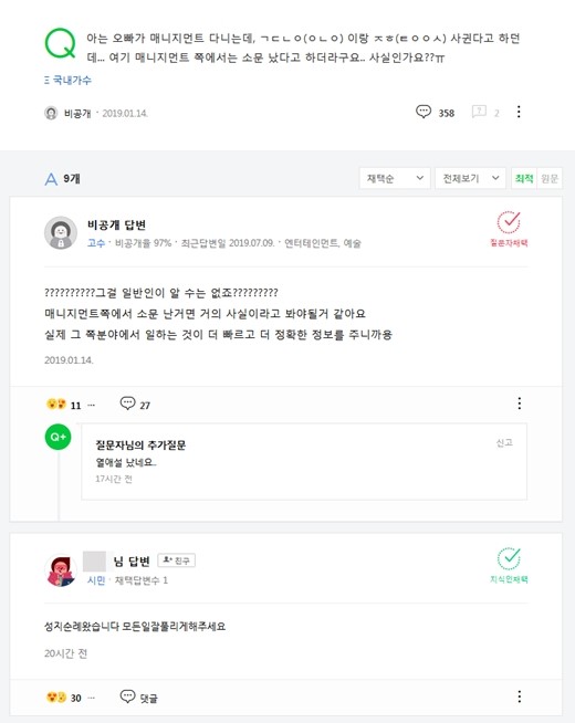 今年1月、「NAVER知識in」(日本のヤフー知恵袋に相当)には、「知り合いのオッパ(兄)が、K.D.N.EとJ.Hが付き合っていると言っていた…マネジメント側で噂になっていると言っていたんですよ。本当ですか?」という質問が上げられていた。