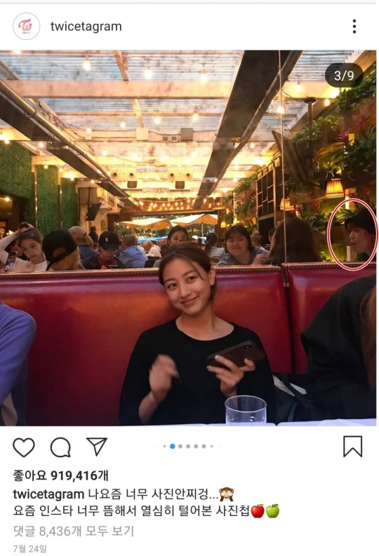 7月24日のTWICE公式インスタグラムには、ジヒョがファンに近況を伝える記事が掲載された。ところが、その公開された写真にカン・ダニエル似の男性が写っているとして話題になった。