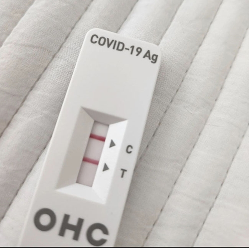 公開された写真は使用後の新型コロナ自己診断キットで、2本の赤いラインが陽性を示している。