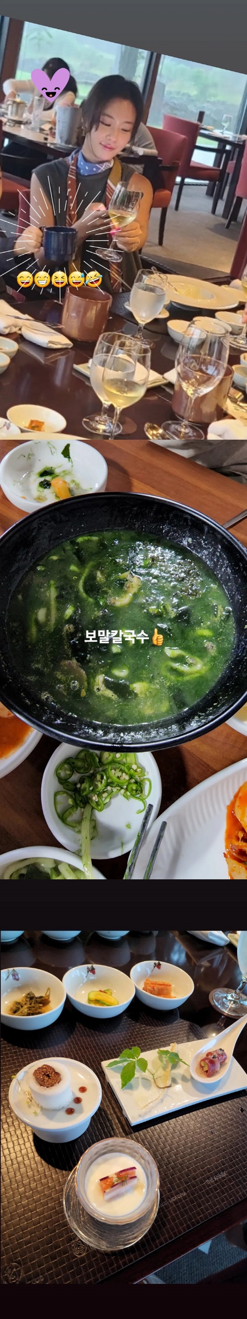 公開された写真にはレストランで食事を楽しむファン・ジョンウムの姿が。カルグクスや海鮮のコース料理まで、色とりどりの食品が並べられている。