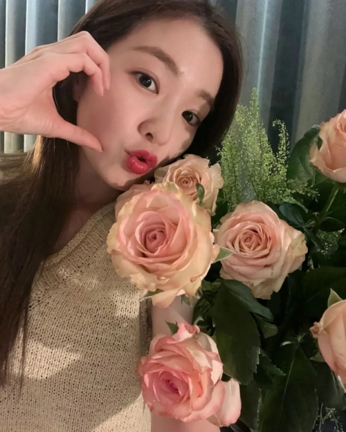 アイリーンはバラの近くで“顔ハート”ポーズを披露。唇を窄めて愛らしい表情を浮かべている。