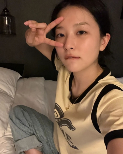 スルギは自宅のベッドと思わしき場所で自撮り撮影をしている。ピースをする顔は化粧気がなくナチュラルな美貌を誇った。