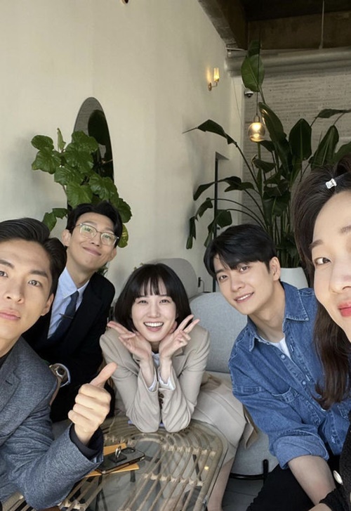 また別の写真には、パク・ウンビン、ハ・ユンギョン、チュ・ジョンヒョク、カン・ギヨン、カン・テオの主要キャストが明るく笑っている姿が収められている。ドラマが好調ということもあり、和気あいあいとした良い雰囲気のようだ。