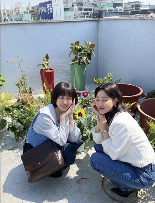 ハ・ユンギョンはウ・ヨンウ役のパク・ウンビンと並んで座り、愛らしい笑顔を見せている。2人のかわいいポーズと笑顔が見る者の顔をほころばせる。