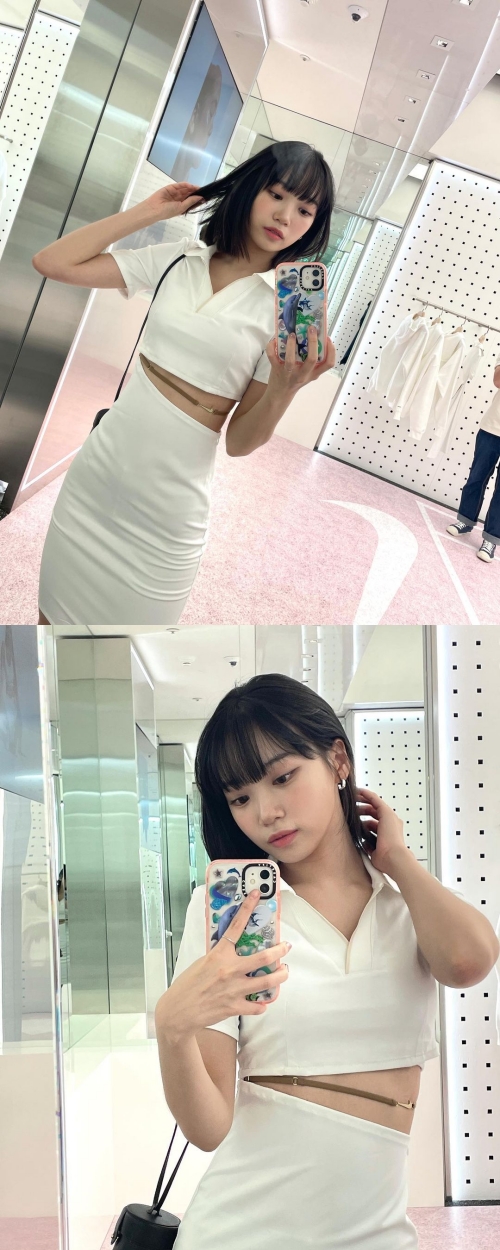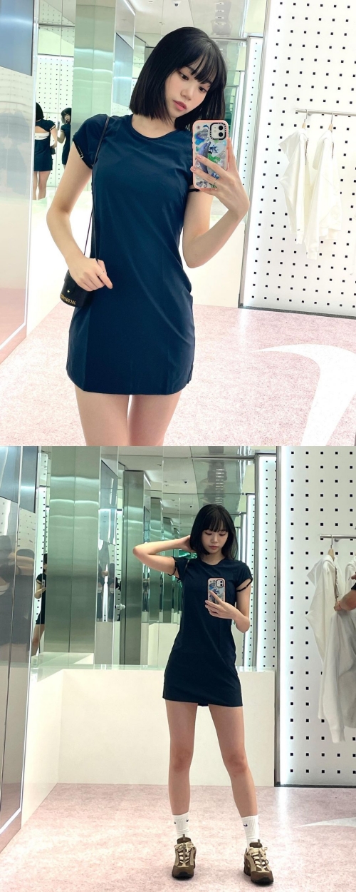 チェウォンはクロップド丈トップスやロングスカート、ネイビーのワンピースなどを着用しており、細く白い手足やウエストがのぞく。