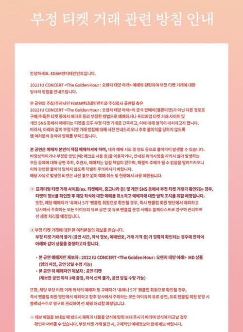 EDAMは、「2022 IUコンサートの公式販売先(Melonチケット)ではない別の経路で購入・取得したチケットのなかで、マクロなどの不正な方法で前売りしたり、プレミアムチケット取引サイトおよび個人SNSなどで売買されるチケットを、全て不正取引と見なす」とし、「これに対して厳格に対処しようと思う」と伝えている。