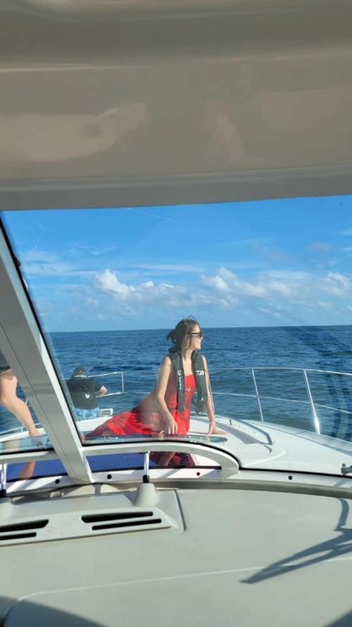 公開された写真には、ファン・ジョンウムと家族がヨットクルーズを楽しむ姿が収められている。真っ赤なドレスが青い海、空と見事なコントラストを成している。