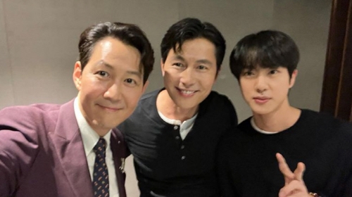 公開された写真は、イ・ジョンジェとチョン・ウソン、そしてBTS(防弾少年団)のJINのスリーショットだった。穏やかな笑顔でカメラを見つめる3人からは、まるで兄弟のような温かみが感じられる。