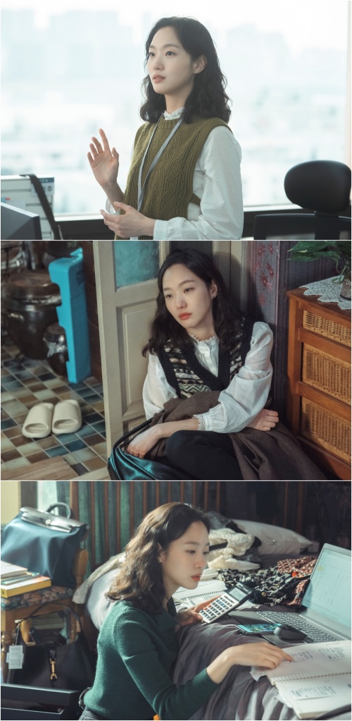 公開された写真には、完全に役になりきったキム・ゴウンの姿が。キム・ゴウンはお金が好きで経理に就職した「オ・インジュ」役を演じている。