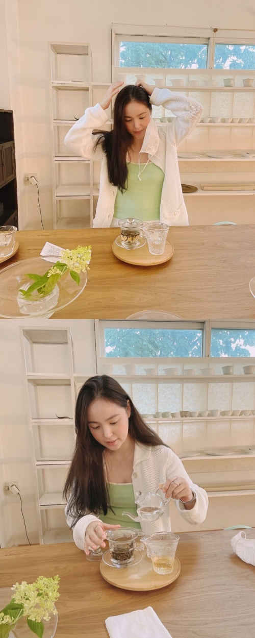 写真には、優雅にティータイムを楽しむミン・ヒョリンの姿が収められている。