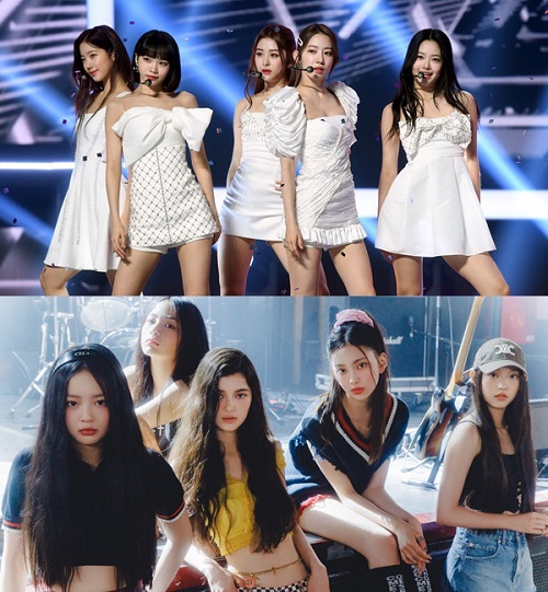 (写真提供=スポーツソウル、ADOR)LE SSERAFIM(上)とNewJeans