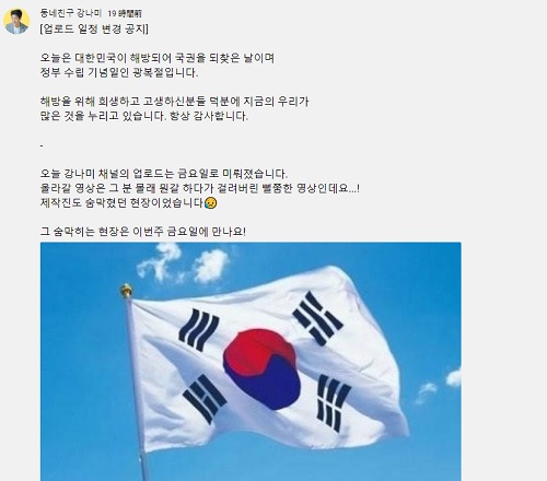 その文章でカンナムは、「今日は大韓民国が解放され、国権を取り戻した日であり、政府樹立記念日でもある光復節」とし、「解放のために犠牲となり、苦労した方々のおかげで今の私たちが多くのものを享受している。いつもありがとうございます」と伝えた。帰化試験合格後、初めて迎えた光復節の感想だ。