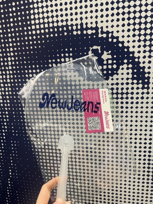 受付から約4時間30分過ぎた16時19分頃、ようやく本紙記者もストアに入場することができた。入場待機列に並ぶと、NewJeansのロゴが入った透明なうちわを受け取った。