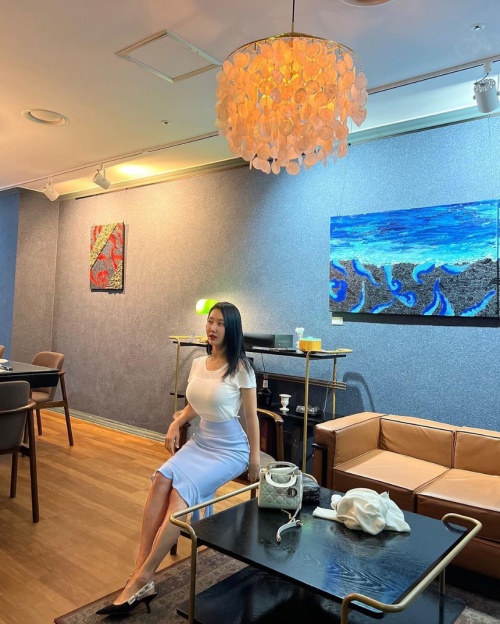 併せて公開された写真には、白い上着に空色のスカート姿のイ・スジンが写っている。露出していなくても、圧倒的な体つきが目を引く。