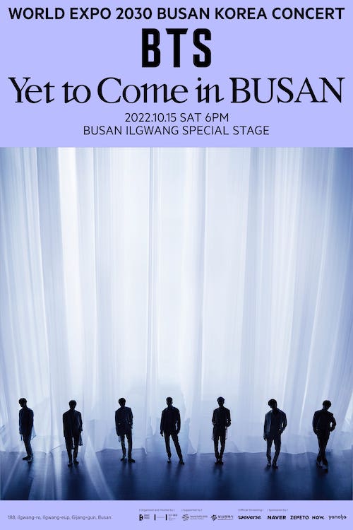2030釜山万博広報大使に公式委嘱されたBTSは、2030年国際博覧会の釜山誘致に対して全世界からの関心を集めるため、また応援を得るため、今回のグローバルコンサート「WORLD EXPO 2030 BUSAN KOREA CONCERT BTS <Yet To Come> in BUSAN」を皮切りに、多様な広報活動を行っていく計画だ。