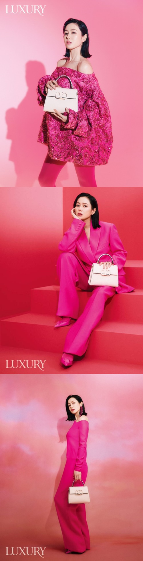 どの写真も上下をピンクで合わせたコーディネートを完璧に消化し、プロフェッショナルな雰囲気で見る者を圧倒していた。