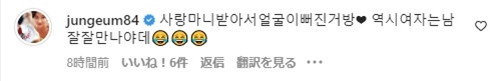 そしてこの投稿には、アユミと同じSuger出身の女優ファン・ジョンウムが、「たくさん愛されて顔が美しくなったよ。やはり女性は男性によく会わなければならない」というコメントと笑顔の絵文字を残している。