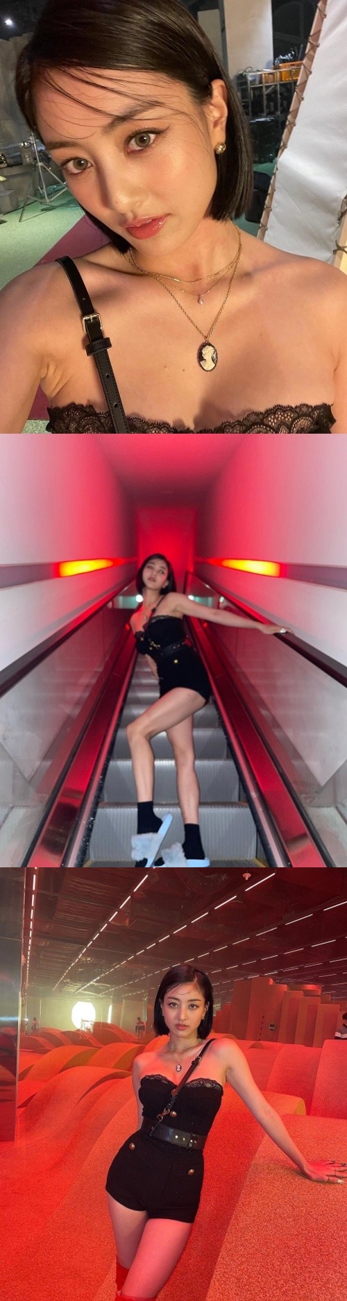公開された写真でジヒョは、黒の衣装を着てシックなスタイルを見せた。特にエスカレーターで撮っている写真は彼女の美脚が強調されおり、視線を奪う。