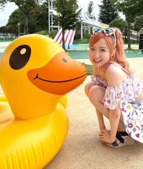 写真には、アヒルの浮き輪とツーショットを撮る本田仁美の姿が写っている。