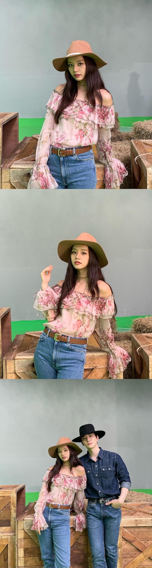 写真の中のヘリは、オフショルダーのブラウスとジーンズ、カウボーイハットを合わせ、特有の明るくて愛らしい雰囲気を醸し出しながら美貌を誇っている。