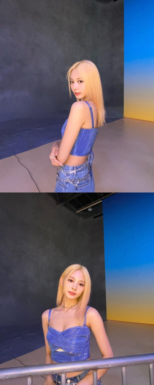 リラックスした表情を浮かべるツウィは、クロップド丈のキャミソールにデニムのショートパンツを合わせて、はつらつとした雰囲気だ。普段からダークトーンの印象が強いツウィだが、金髪もよく似合っている。