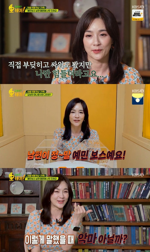 キム・ボミンは「夫が敏感なボスだ。時計の秒針の音も嫌いなので、そのような(アナログ)時計もない。変化を嫌うので、いつも同じ食堂にばかり行く。道を探せなければ、より敏感だ。聴覚、嗅覚、味覚ともに敏感だ」と悩みを語った。
