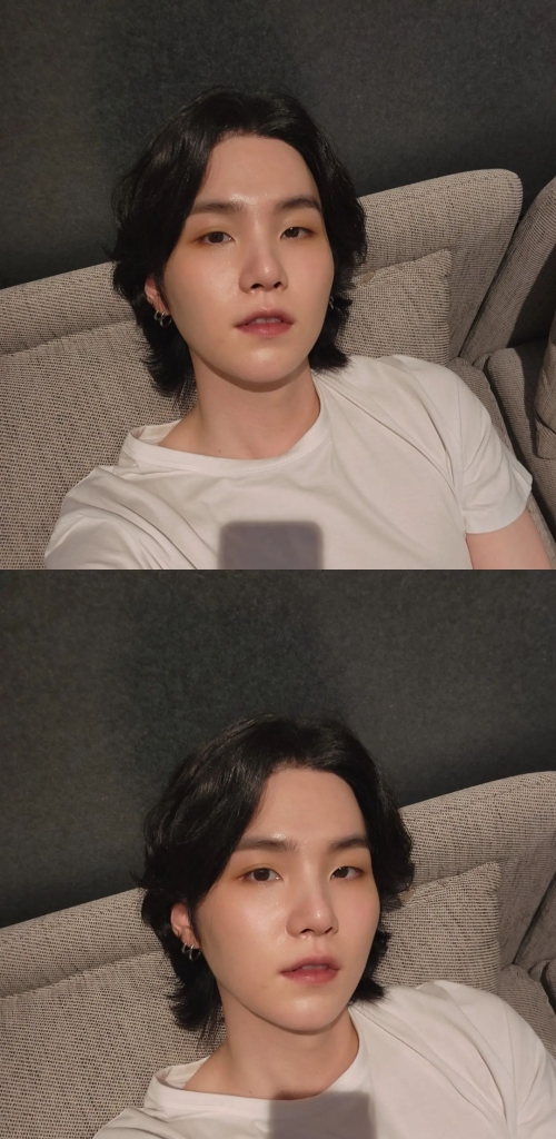 写真には、自撮りをするSUGAの姿が。口を薄く開きながらおぼろげな表情を浮かべており、ソファに寄りかかりながらリラックスしている。