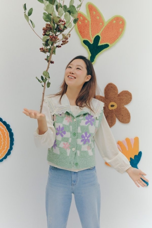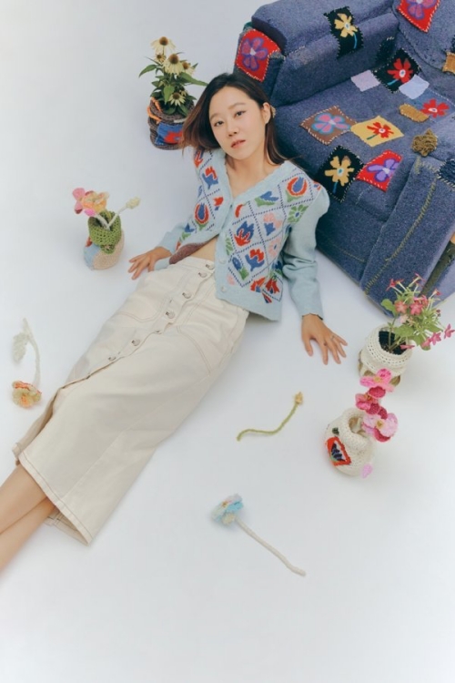 花柄のニットやカチューシャ、レース素材のトップスなど、パステルトーンのファンシーなアイテムを愛らしく着こなして、“コンブリー”(コン・ヒョジン+ラブリーの合成語)の面貌を見せつけた。