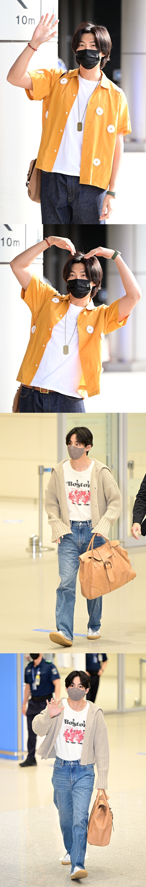 黄色のフラワーパターンシャツとルーズなデニムスタイルで空港に登場したRMは、カメラに向かってハートと挨拶を惜しまなかった。