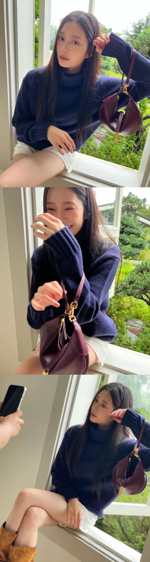 ロングヘアをおろして清楚な雰囲気をまとい、紺色のニットで秋を先取りするキム・ミンジュ。ショートパンツからはすらりと美脚が伸びている。