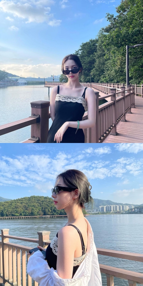 別の写真には、風にあたりながらどこかを見つめるKARINAの横顔が。美肩や背中を見せる姿にファンからの反応も大きい。