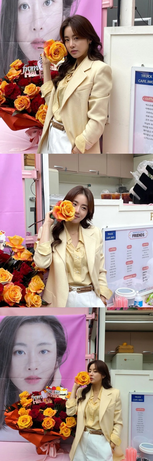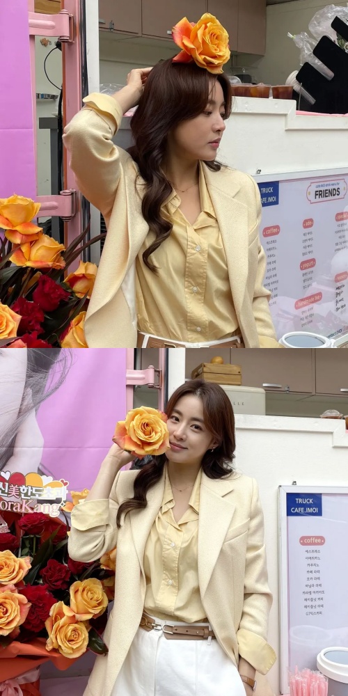 写真には、撮影現場にプレゼントされたコーヒーカーと一緒に送られた大きな花束の横に立ち、ポーズを決めているカン・ソラの姿が写っている。そして動画では、完璧だと表現してもいいほど滑らかな脚線美が目を引く。