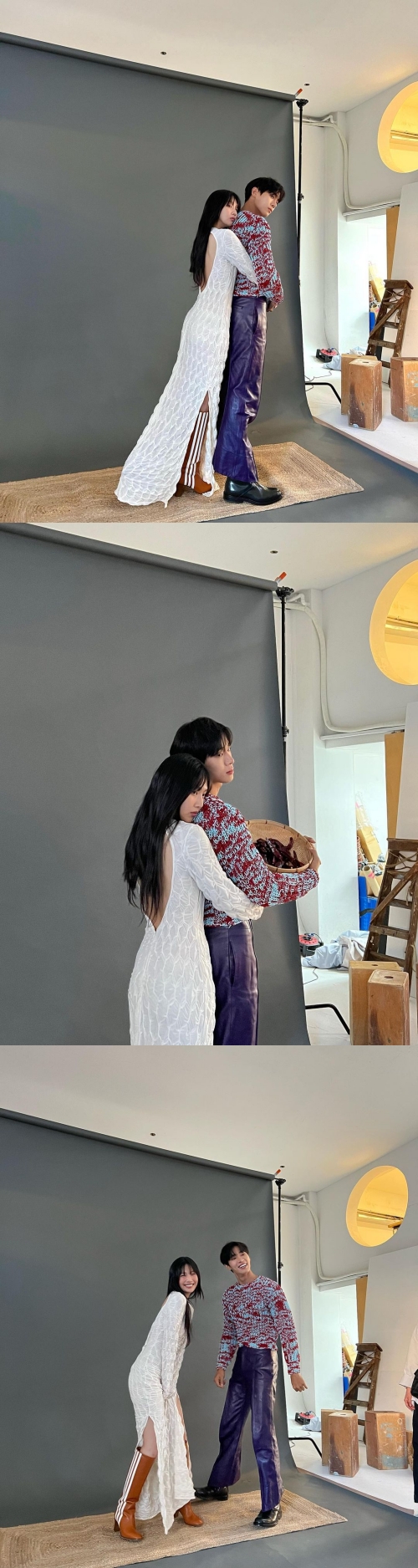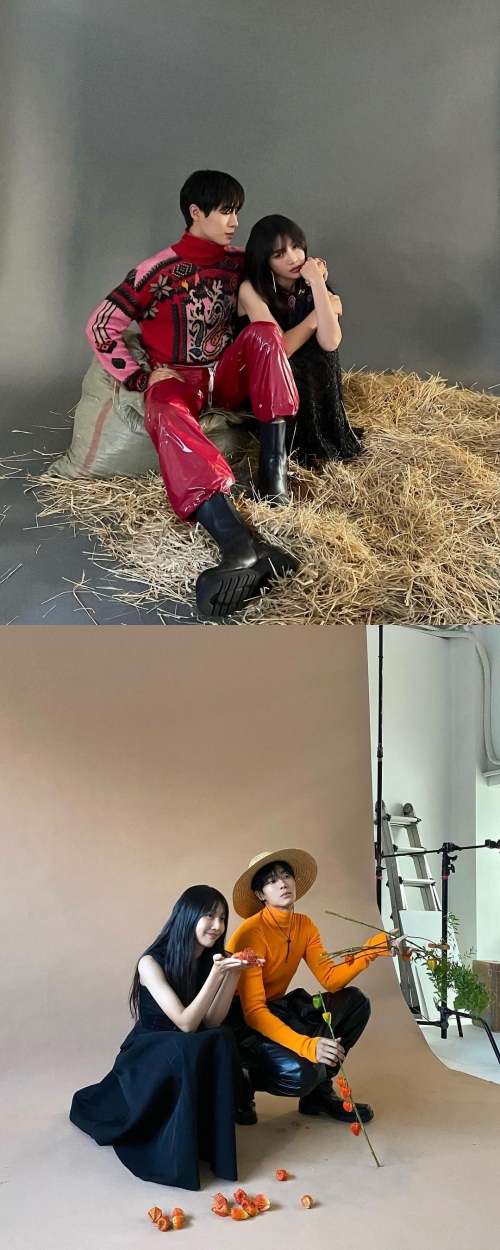 写真には、スタジオで撮影に臨むジョイと俳優チュ・ヨンウの姿が写っている。