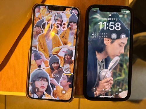 写真を見ると、それぞれBTSのV、歌手パク・ヒョシンが背景画像に設定されたスマートフォン2台が写っている。