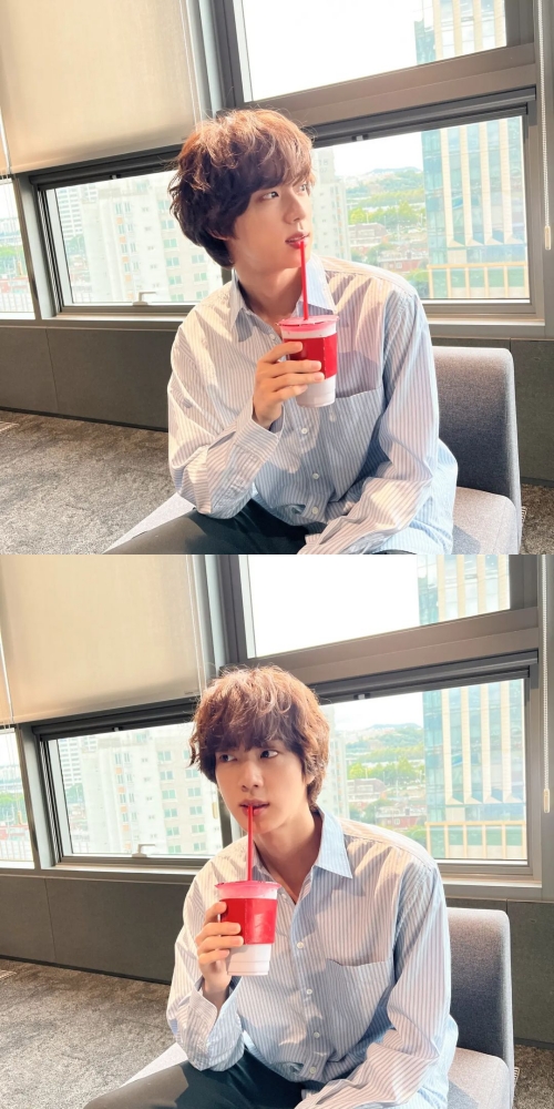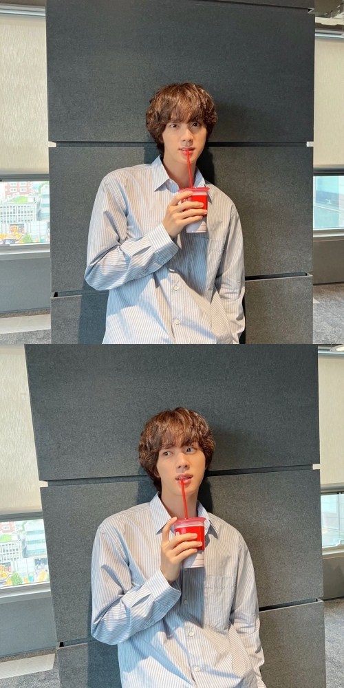 写真には、飲み物を片手にどこかを見つめるJINの姿が。最近“イメチェン”したパーマ姿に、ストライプシャツ姿で可愛らしい雰囲気だ。