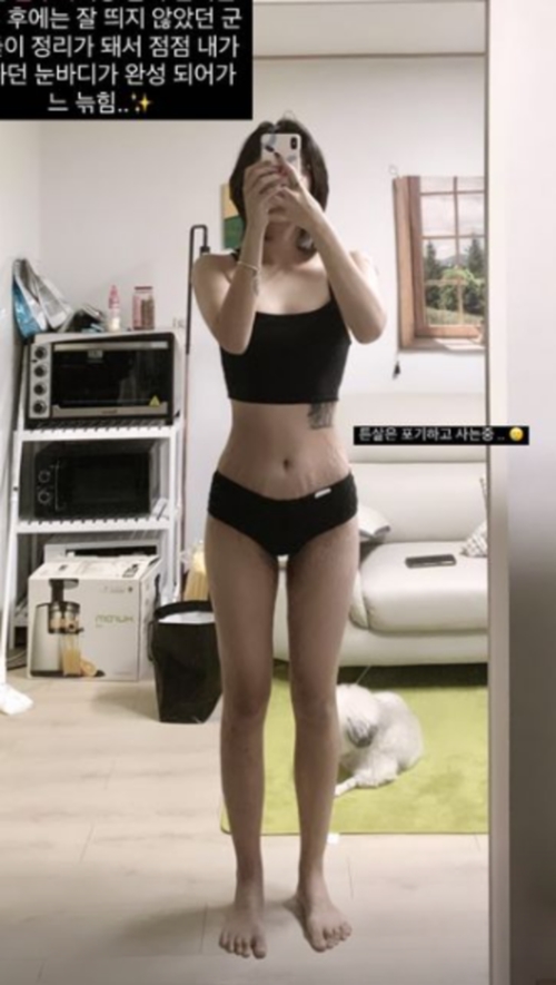 特に目を引くのは、チェ・ジュンヒの平たいお腹の下にある、小さくふっくらとした肉だ。急激な体重変化によって生じた脂肪について、チェ・ジュンヒは「丈夫な肉は諦めて生きている…」と残念な気持ちも伝えている。