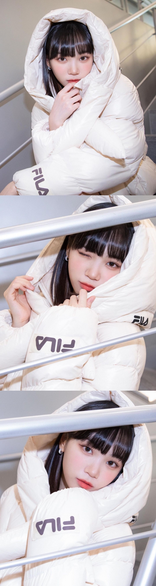 鼻や頬のチーク、赤みを帯びたリップなどのメイクが、チェウォンのあどけない魅力を最大限に生かしている。