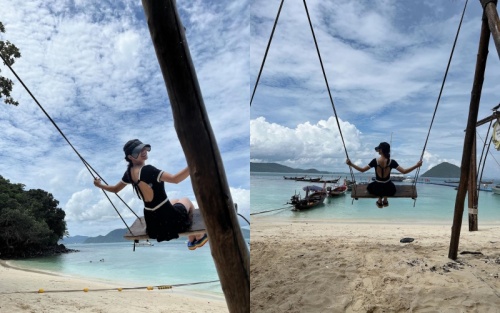 ラッシュガードを着たままベンチに横になり余裕のある日常を過ごしたり、背中が見える大胆な服を着て、楽しそうにブランコに乗っている。