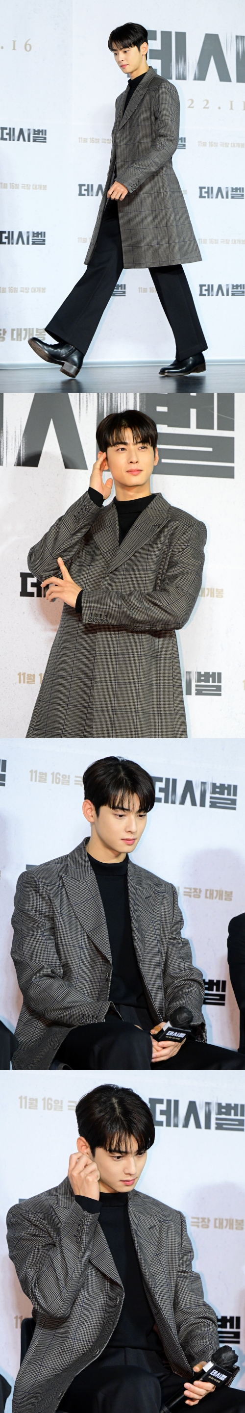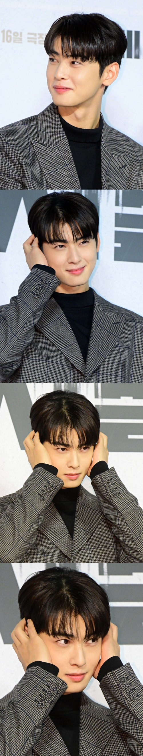 チャ・ウヌはチェック柄のコート姿、中には黒のトップスにパンツを合わせたスタイリッシュな装いを披露した。