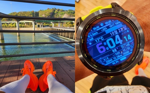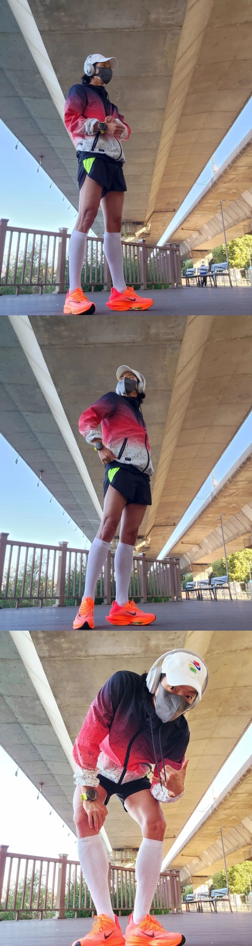 ヘッドフォンをして、全身スポーツウェアに身を包む姿や、歩数が表示されたスマートウォッチの写真からランニングを楽しんだ様子がうかがえる。