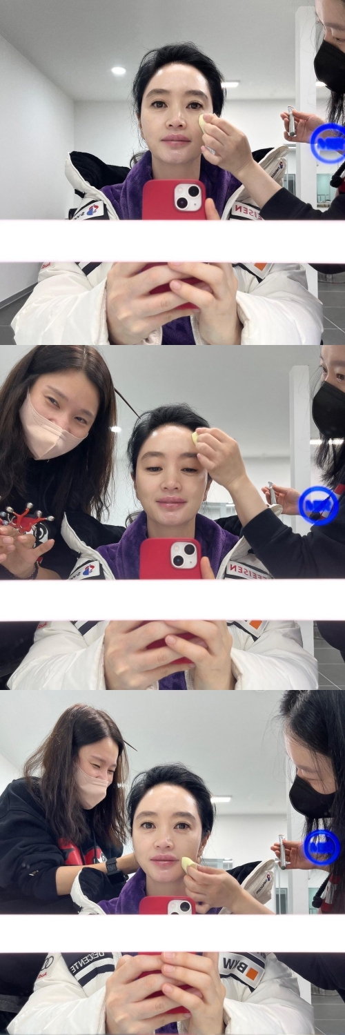 下からのアングルで撮影したにも関わらず、相変わらずの美貌を誇るキム・ヘス。何より、はっきりとした目鼻立ちに艶々と発光している肌と、メイク途中でありながらすでに完成されたビジュアルを見せつけている。