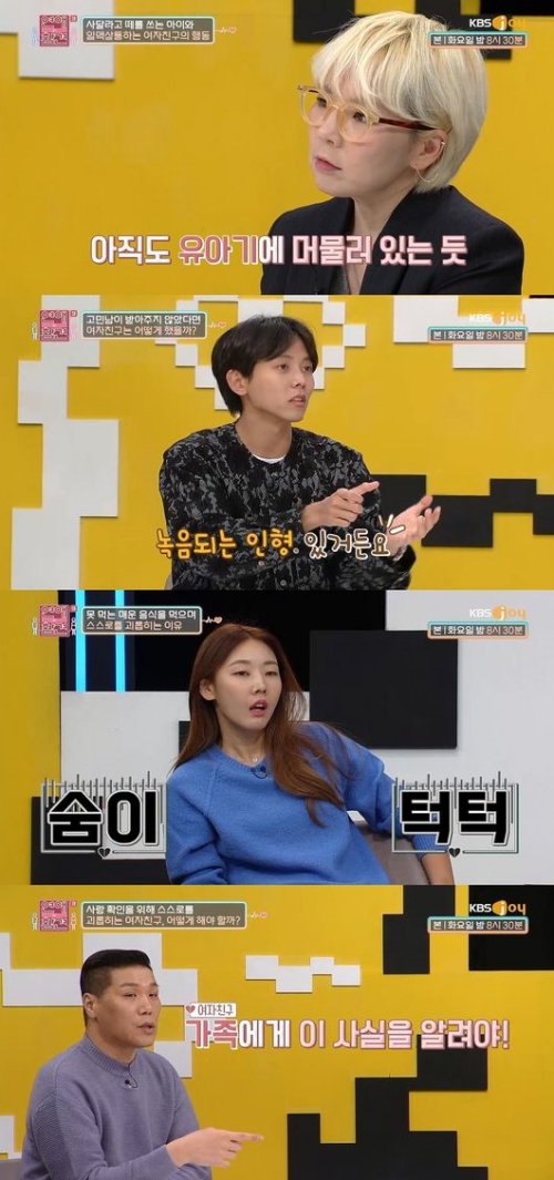 彼女の行動を聞いた番組出演者のクァク・ジョンウンは「彼女は未だに3~4歳にとどまっている。道端に座りこんでチョコミルクを買ってあげるまで泣いているようなもの。幼児期」と分析。チュ・ウジェは「愛してるという言葉が必要なら、録音可能な人形を使ったらどうだろう」と呆れた表情を見せた。