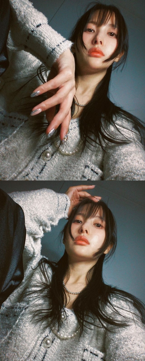 パールのついたニットを着用し、熱ったような赤みを帯びたメイクが施されたギュリは、上から見下ろすような凜とした眼差しを披露。フレッシュで洗練された美貌が全面に押し出されている。