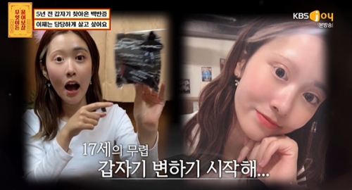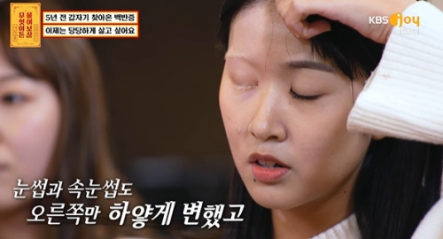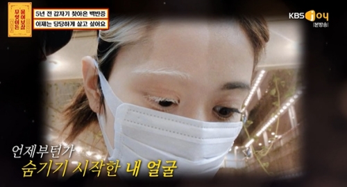 日本人女性は「5年前から急に白斑症が現れた。以前と変わった姿が悩みだ」と話した。「片方の白くなってしまった顔も勇気を出して堂々と生きたい」と語った。いつから症状があったのかMCが尋ねると、「高校1年生のとき、顔の半分が白くなり始めた」とし、「眉毛から髪の毛などが徐々に白くなり、今ではもっと広がっている」と話した。