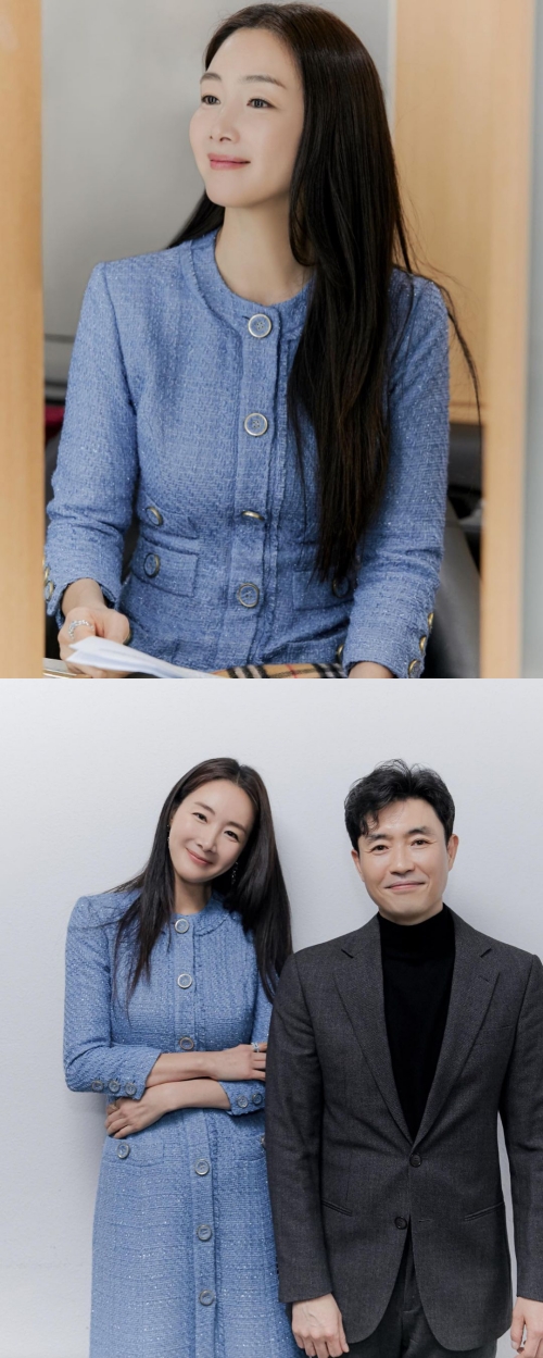 写真には、優雅な笑みを浮かべるチェ・ジウの姿が。ツイード素材のロングドレスが印象的だ。