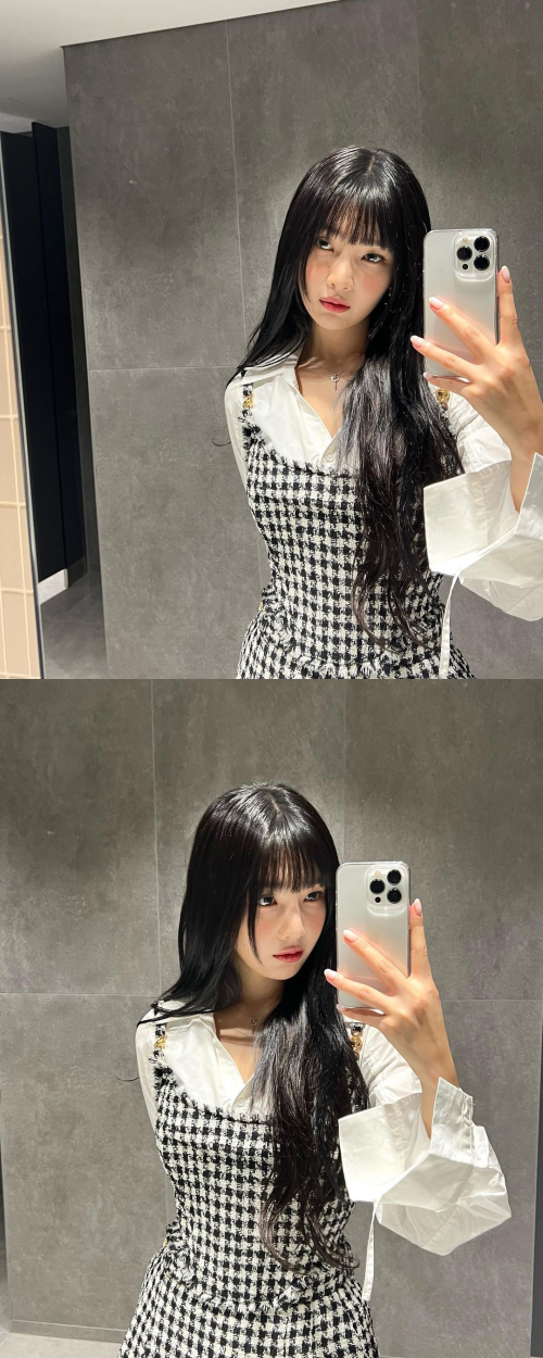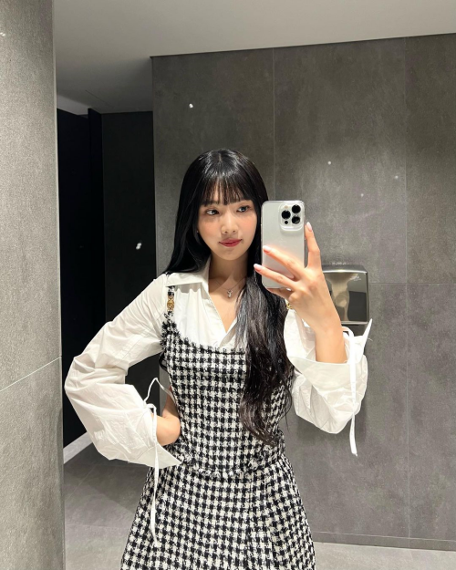 写真には白いシャツにワンピースを合わせ、清潔感漂うジョイの姿が。腰までくるロングヘアを下ろし、大人っぽく仕上げた。